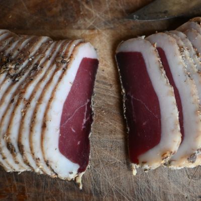 Les magrets sont séchés environs 2,5 mois, minimum, en séchoir régulé(Température et humidité) en croute de mélange de Poivres et d'Aromates (Mélange "maison" de baies et poivres (5) et d'herbes aromatiques (3). 1 magret pèse environ 300gr (Pesé à la préparation de la commande) ils sont tranchés au couteau main.